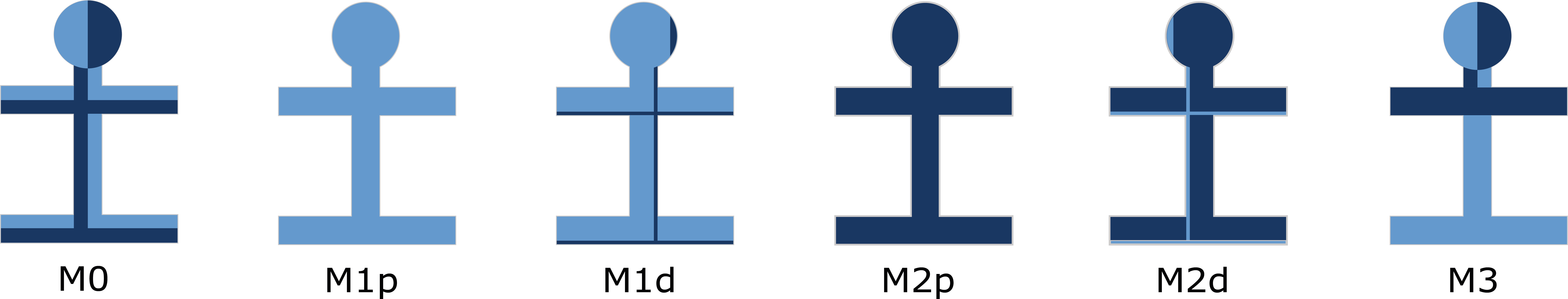 ALS phenotype classification according to the degree of upper and/or lower motor neuron dysfunction (UMN/LMN). M0, balanced UMN and LMN; M1p, pure UMN dysfunction; M1d, dominant UMN dysfunction; M2p, pure LMN dysfunction; M2d, dominant LMN dysfunction; M3 dissociated upper and lower motor neuron dysfunction M3. Light blue, UMN dysfunction; dark blue, LMN dysfunction.