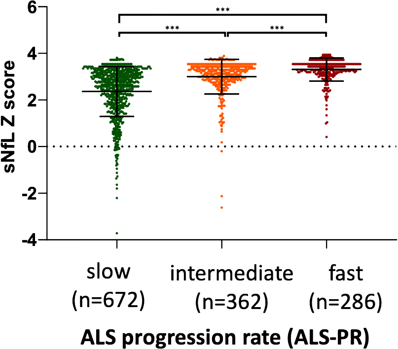 Serum concentration of NfL is more elevated in patients with faster progressing ALS compared to slower ALS progression. Slow (<0,5 ALSFRS-R/month), intermediate (0,5-1,0) and fast (> 1,0). ALS-PR, ALS progression defined as monthly change of the ALS functional rating scale (ALSFRS-R). Figure, courtesy of the authors of reference (2).