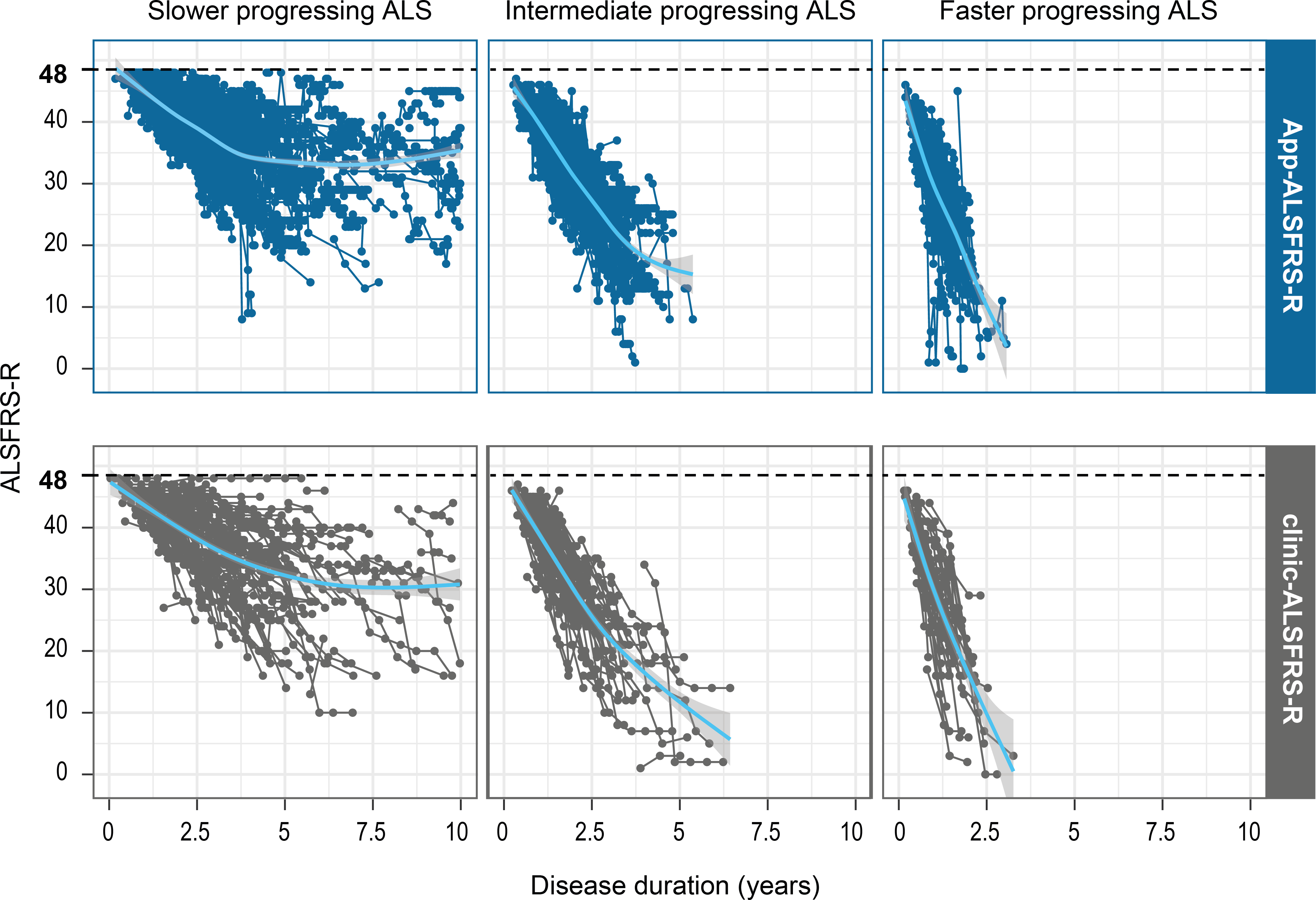 Overview of ALSFRS-R assessments during clinic visits and via the ALS App as analyzed in 3 groups of ALS progression rate (ALSPR), respectively: slower progressing ALS (<0.5 ALSFRS-R/month), intermediate progressing ALS (≥0.5 and ≤1.0 ALSFRS-R/month) and faster progressing ALS (> 1.0 ALSFRS-R/month). Every dot represents one assessment. The mean progression is shown in the blue graph and the shadow represents its variation. Figure, courtesy of the authors of reference (3).