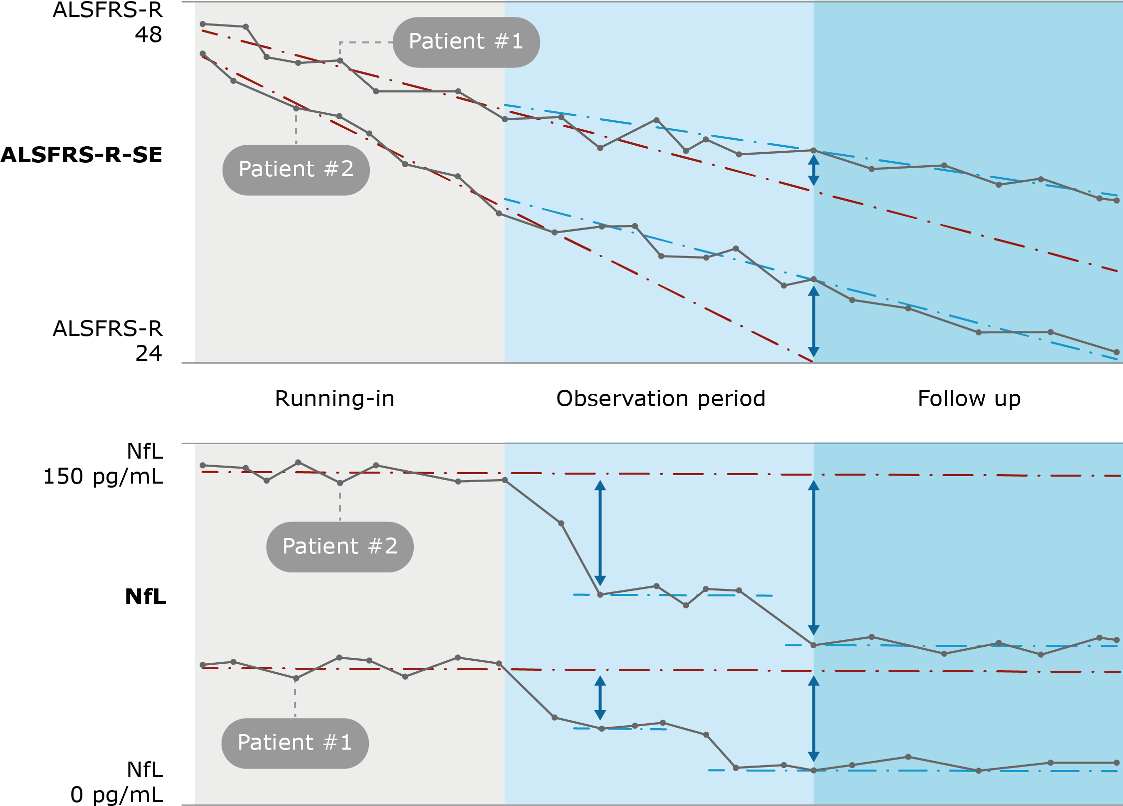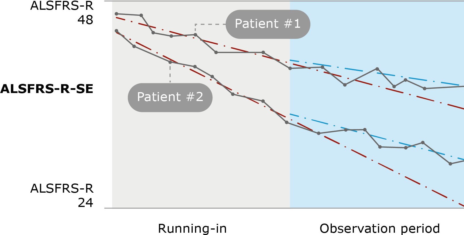 ALS progression (ALS-PR) as measured by the monthy change of the ALSFRS-R (“slope”) before (“running in”) and during treatment (“observation”) serve as primary outcome parameter. In this example, patient #1 and #2 show different ALS-PR at baseline, and reductions of ALS-PR during treatment with an investigational drug.