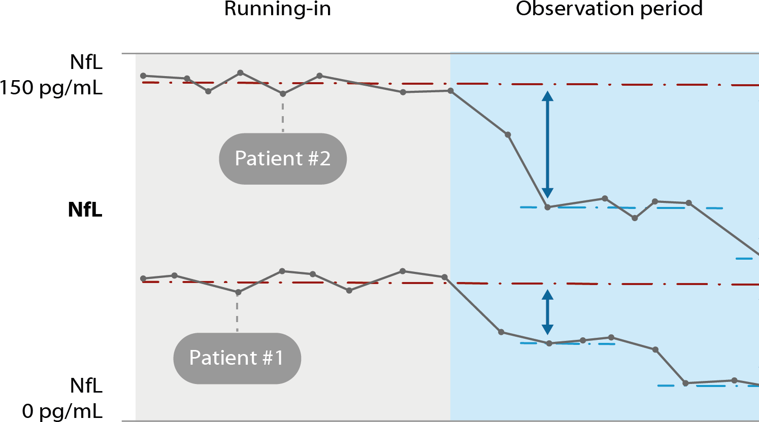 Serum concentration of NfL before (“running in”) and during treatment (“observation”) serve as treatment response marker. In this example, patient #1 and #2 show different levels of NfL elevation at baseline, and NfL reductions during treatment with an investigational drug.
